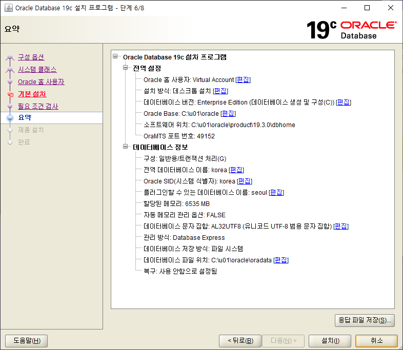 (5) 설정 정보를 요약해주는 창이 나타나고, 설정한 대로 잘 나왔다면 설치를 눌러 진행해주면 된다.