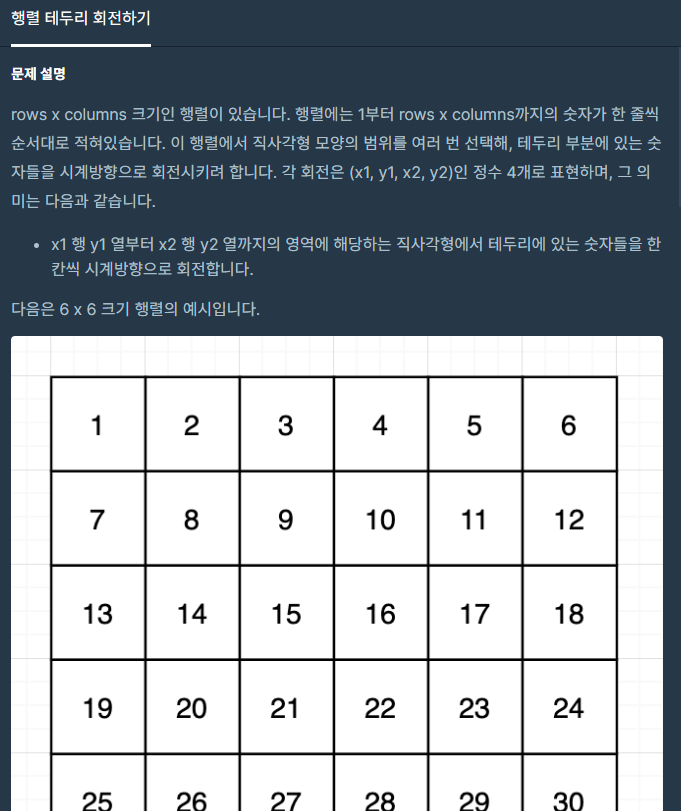 전체 문제는 이곳에서(https://programmers.co.kr/learn/courses/30/lessons/77485) 확인할 수 있다.