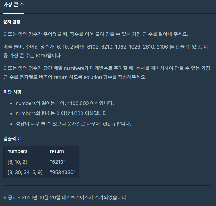 import java.util.Arrays; class Solution { public String solution(int[] numbers) { String answer = ""; String[] numSet = new String[numbers.length]; for(int i=0; i<numbers.length; i++) { numSet[i] = Integer.toString(numbers[i]); } // for // 30, 3과 같은 숫자가 들어올 때 303이 되는 것을 방지 // 문자열 두개씩 묶어서 비교한다. Arrays.sort(numSet, (o1, o2) -> (o2+o1).compareTo(o1+o2)); if(numSet[0].equals("0")) { return "0"; } for(String str : numSet) { answer += str; } // for return answer; } // solution } // end class