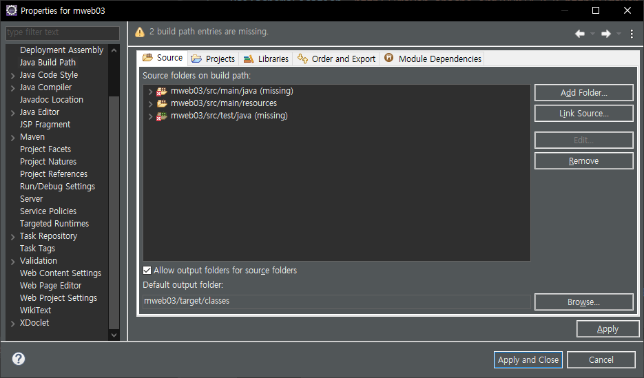 첫번째 Output folder의 경로를 target/test-classes로 설정한다.
