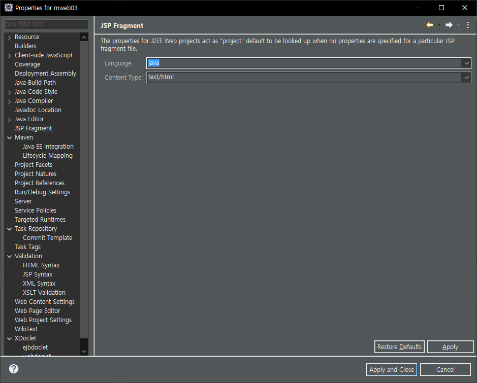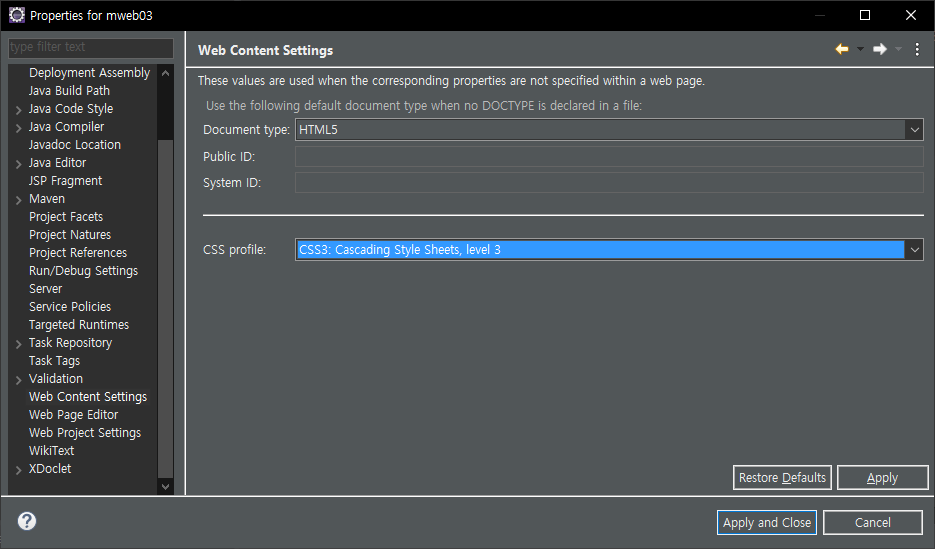 Web Content Settings에서 Document type: HTML5, CSS profile: CSS3을 선택한다.
