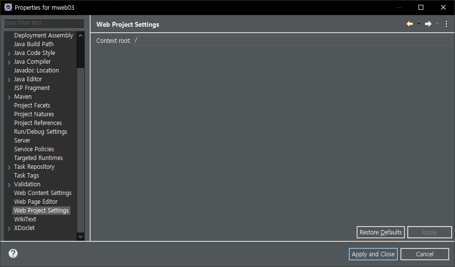 Web Project Settings - root폴더 경로를 설정할 수 있다. Default값은 /