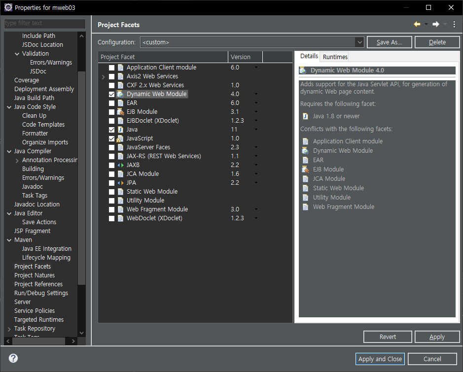 업데이트 후 properties - project facets 탭에서 Dynamic Web Module 버전이 4.0으로 반영되었는지 확인한다.