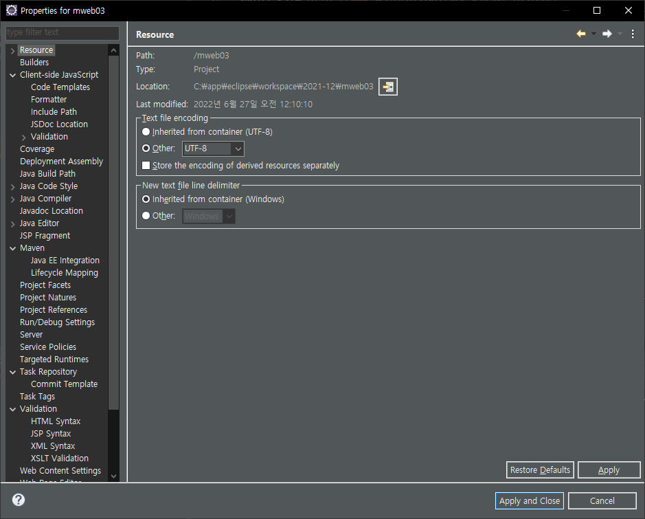 마지막으로 Resource에서 인코딩이 UTF-8로 되어있는지 확인 후 창을 닫는다.