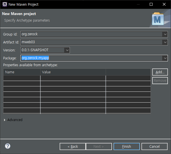 Artifact Id는 프로젝트폴더의 이름을 지정한다.