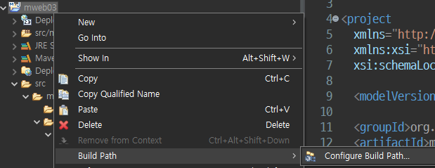.xml파일이나 설정을 변경했을 땐, 프로젝트 폴더 우클릭 - maven - update project를 해서 설정을 바로바로 반영해주는 것이 좋다.
