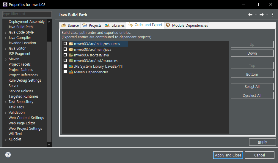 main(java - resources) - test(java -resources) 순서이다. 순서가 이상하게 되어있다면 우측 up/down, top/bottom을 눌러 제대로 정렬해준다.