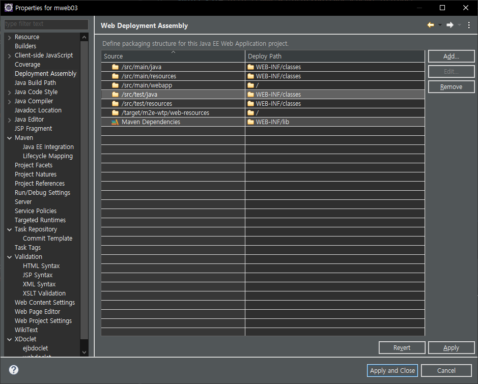 Deployment Assembly에서 test폴더를 모두 Remove한다.