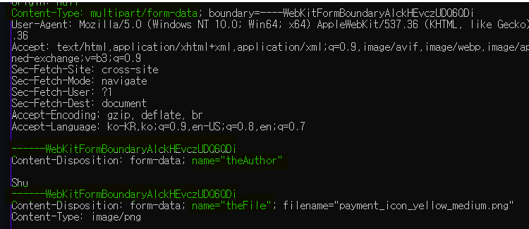 그리고 전송한 항목들이 각각 WebKitFormBoundary로 나뉘어 전송된 것을 확인할 수 있다.