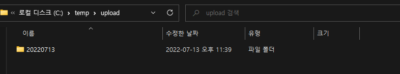 // 현재 경로에 현재날짜폴더 생성하기 String uploadPath = "C:/temp/upload/" + fileDate; File uploadDir = new File(uploadPath); // 해당 경로가 없으면 폴더를 생성 if (!uploadDir.exists()) uploadDir.mkdir();업로드할 경로에 아까 구한 fileDate를 붙여준다.