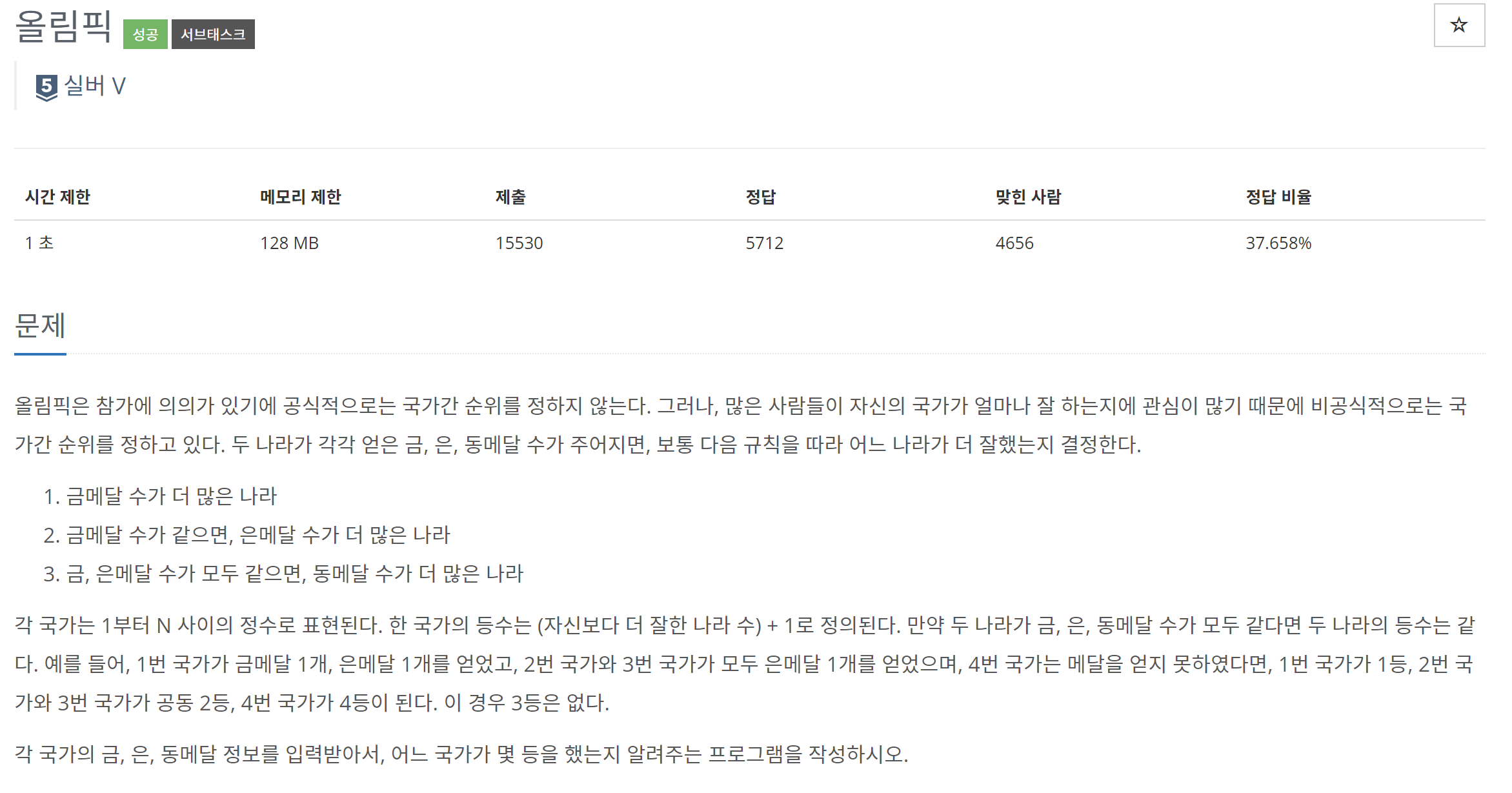 특히 '금은동 메달 수 가 같으면 두 나라의 등수는 같다' 조건을 처리하는 부분이 까다로웠다.