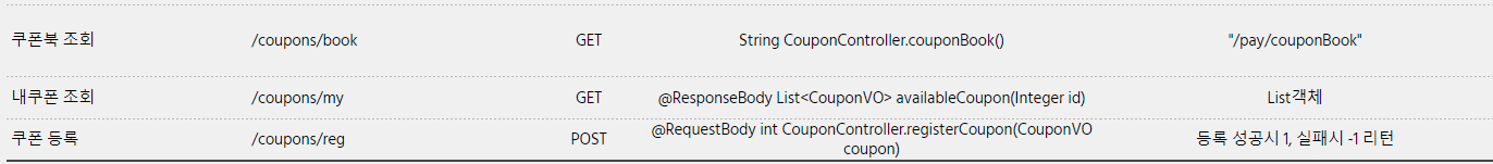 쿠폰북 방식 - 탭으로 메뉴가 구분된다. 쿠폰 등록도 마찬가지로, ajax로 처리하면 페이지의 새로고침 없이 등록된 쿠폰을 보여줄 수 있을것 같아 이렇게 설정했다. 매개변수나 리턴타입 등등은 일단 생각하는 대로 설정해봤는데, 구현하면서 계속 수정할 예정이다.