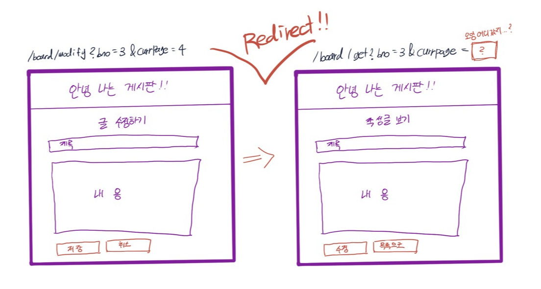그러나 리다이렉트로 이동하였기 때문에 이전 요청은 종료되고 새로운 요청이 발생하여 현재 페이지 번호를 나타내주는 currPage파라미터 값을 얻어올 수 없었습니다.