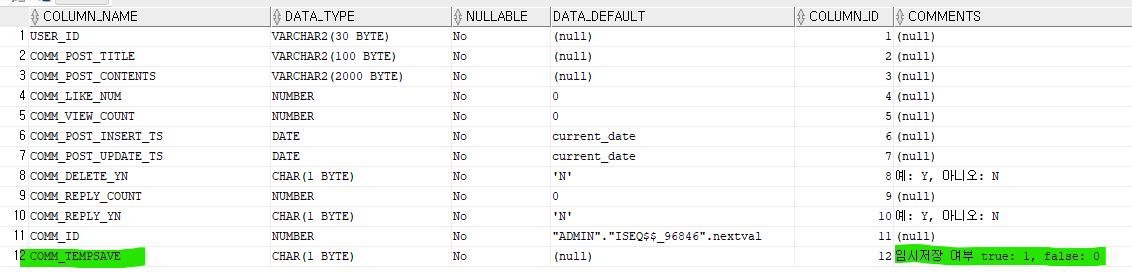 DB의 게시글 테이블입니다. 게시글들은 하나의 테이블에서 관리하고, 임시저장 여부를 컬럼으로 구분하여 사용합니다.