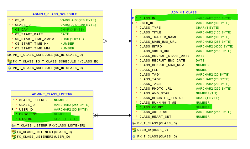 PT에 관련된 ERD PT 테이블(t_class)의 ERD 중 스케줄과 등록 관계를 나타내는 관계만 나타내었습니다. 형광펜으로 표시한 컬럼들이 중요합니다.