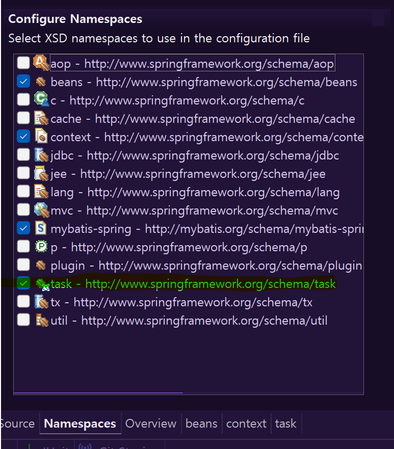 [Namespaces] 탭에서 task를 활성화 시킨 후, 소스코드에 해당 코드를 추가해야 합니다.