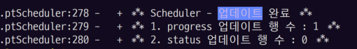 @Override @Scheduled(cron = "0 0 0 * * *") public void ptScheduler() throws ServiceException { log.trace("ptScheduler() invoked."); try { List<String> classIds = this.mapper.selectAllClassId(); log.info("\t 클래스 아이디 리스트: {}", classIds); int progress = 0; int status = 0; for(String classId : classIds) { progress += this.mapper.updateProgress(classId); status += this.mapper.updateStatus(classId); } // enhanced for log.trace("\t+ *** Scheduler - 업데이트 완료 ***"); log.trace("\t+ *** 1. progress 업데이트 행 수 : {} ***", progress); log.trace("\t+ *** 2. status 업데이트 행 수 : {} ***", status); } catch(DAOException e) { throw new ServiceException(e); } // try-catch } // ptScheduler작성한 쿼리문을 실행하는 서비스 메소드를 만듭니다.