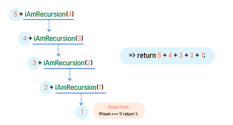 첫번째 iAmRecursion(5)를 수행하게 되면, return문에서 자기자신을 호출하는 코드를 만나게됩니다.