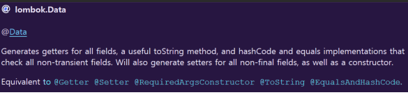 롬복의 @Data 어노테이션의 설명입니다. 사진의 @ToString 이후부터는 DTO객체의 필수사항은 아닙니다.