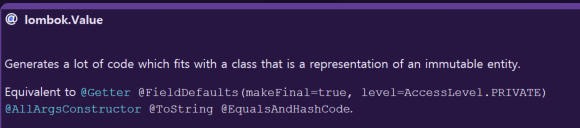 롬복에서는 @Value 어노테이션으로 VO객체를 빠르게 만들 수 있도록 제공합니다.